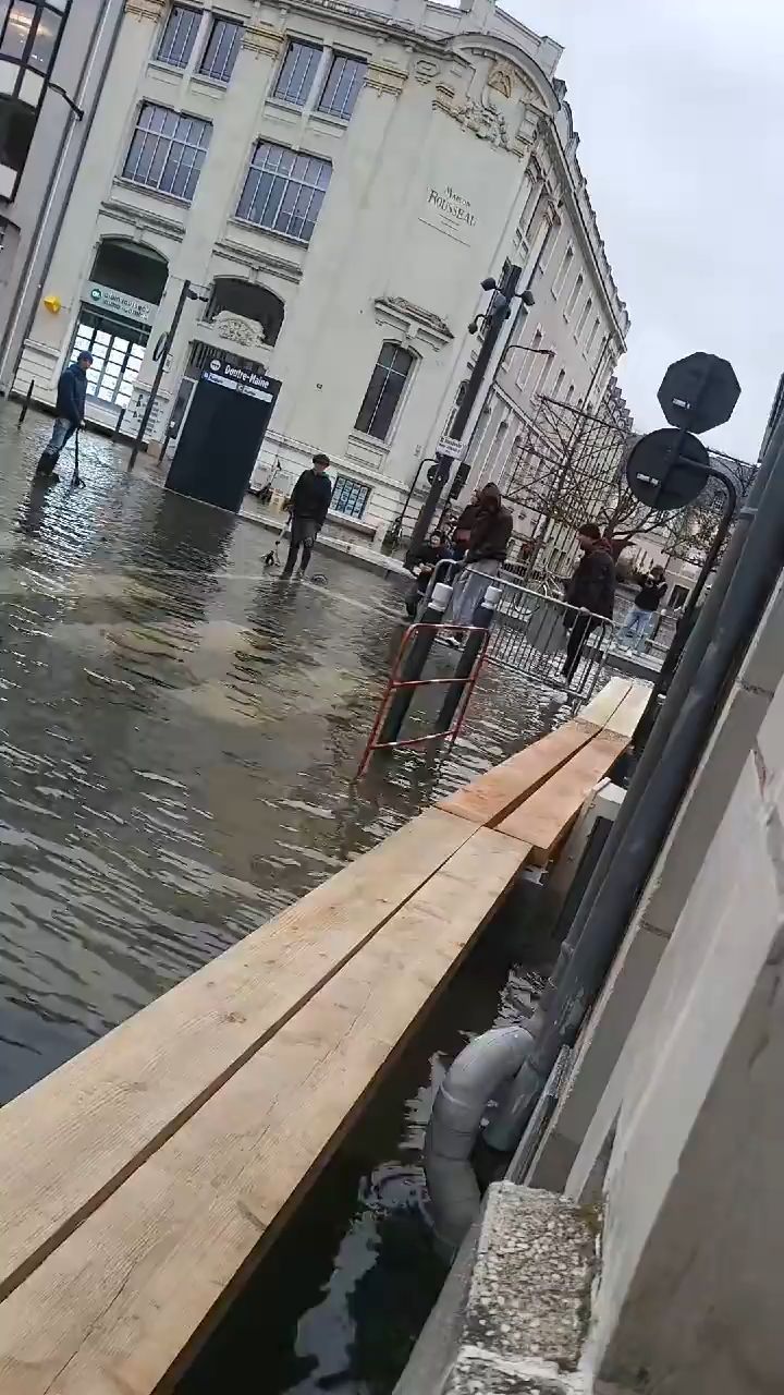Mit dem Gehländer durchs Hochwasser, kreativer Ansatz und pragmatische Lösung ohne nass zu werden.